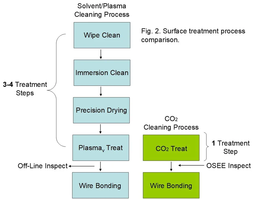 A statistically significant evaluation was performed to determine the effectiveness of an alternative CO2 surface treatment as a comparison to their current cleaning process (2). As shown in Figure 2, the new CO2 process would provide a much simpler and dry surface treatment process. Moreover, a new on-line non-contact bond pad inspection technique evaluation was included in the evaluation as a means for establishing surface cleanliness criteria for wire bonding operations. The Optically Stimulated Electron Emission (OSEE) technique would allow the CO2 cleaning and wire bonding operation to occur in sequence, or even within the same workcell, and without the need for an off-line statistical surface evaluation (current procedure).