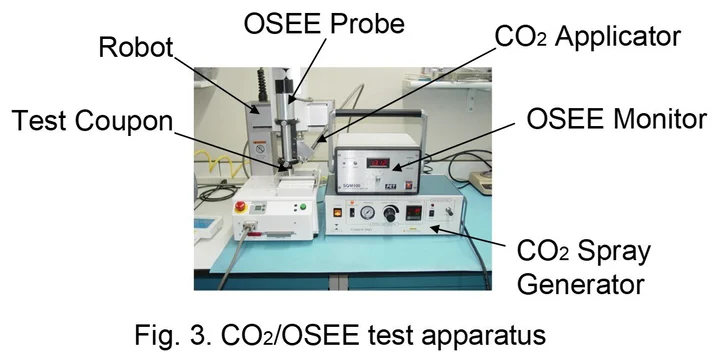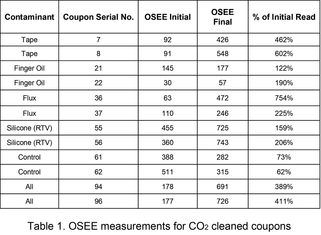 The data shown in Table 1 indicates that OSEE can be reliably employed to determine the cleaning effectiveness of CO2 spray cleaning. The OSEE photocurrent increases with surface cleanliness.