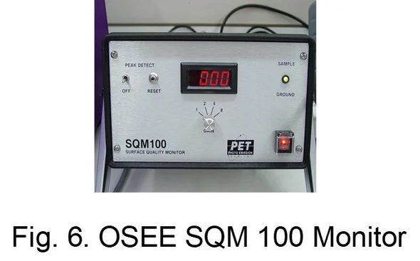 Optically Stimulated Electron Emission (OSEE) is a unique technique for non-invasive analysis of surfaces for molecular contamination (5). This technique utilizes a tool which utilizes ultraviolet radiation to create electron emission from a surface, resulting in a small current detected by the tool. Electron emission is dependent on the substrate’s surface chemistry; hence the electron emission characteristics will change with the presence of a contaminant on the surface, generally by attenuating the signal.
