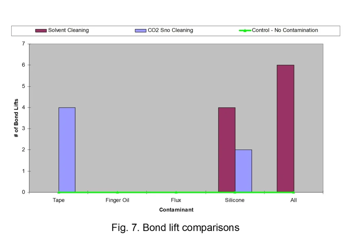 As shown in Figure 7, the CO2 process showed a lower aggregate number of bond lifts as compared to the solvent/plasma cleaning group. CO2 cleaning performed equal to or better than solvent/plasma cleaning process for finger oils, flux, silicone and for all-contaminants mix coupons. Although the contamination data suggests that solvent/plasma cleaning produced better results for tape residue, this was due to contributions from edge contamination residues remaining following selective spray treatment with CO2. This phenomenon is explained in the discussion above under the heading Surface Contamination Challenge. Surface contamination comparisons are provided in the attached technical report.