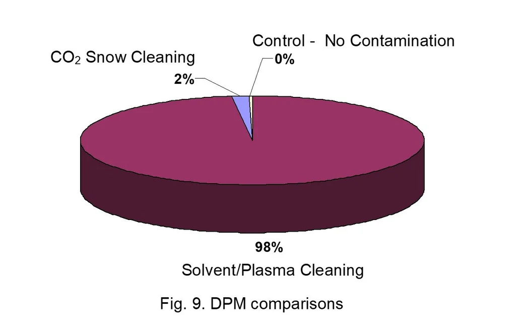 Shown in Figure 9, the data shows that CO2 Cleaning represents only 2% of the DPM as compared to Solvent/Plasma cleaning which represents 98% of the DPM.