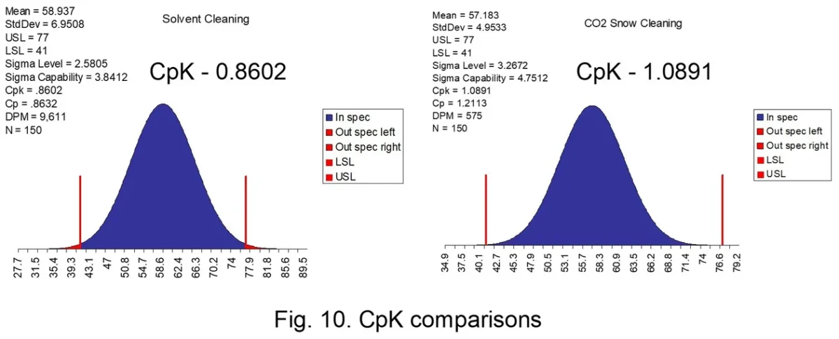 Shown in Figure 10, the CO2 cleaned coupons showed a tighter distribution within the established control limits as compared to Solvent/Plasma cleaning. The CpK data indicates that CO2 cleaning is more effective at removing silicone contamination than Solvent/Plasma cleaning, with the Solvent/Plasma CpK data falling below the Lower Safety Limit (LSL). fig 10