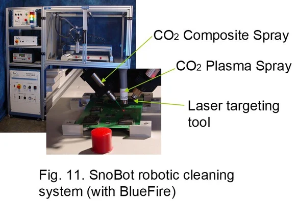 The new selective CO2 plasma-snow surface treatment system (SnoBotTM), shown in Figure 11, features a programmable robotic cleaning system with a Cartesian robot, hybrid spray applicator and air-ionized ESD dissipative minienvironment.