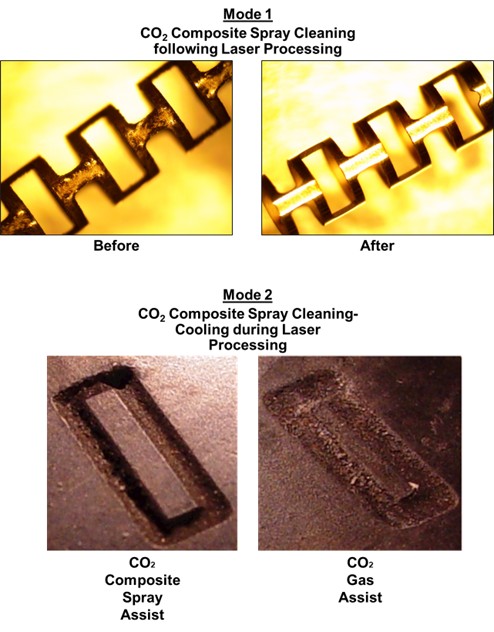 1. Mode 1: Post-Laser Precision Cleaning — A high-velocity, micronized CO₂ particles-in-air aerosol jet applied after laser processing as a dry, precision cleaning step that removes particulates, oxides, and films without abrasives or liquids.