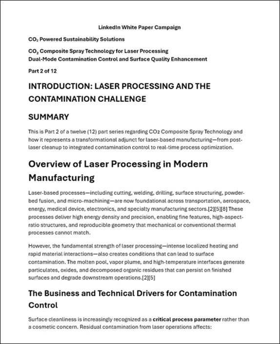 This is Part 1 of a twelve (12) part series regarding CO₂ Composite Spray Technology and how it represents a transformational adjunct for laser-based manufacturing—from post-laser cleanup to integrated contamination control to real-time process optimization.