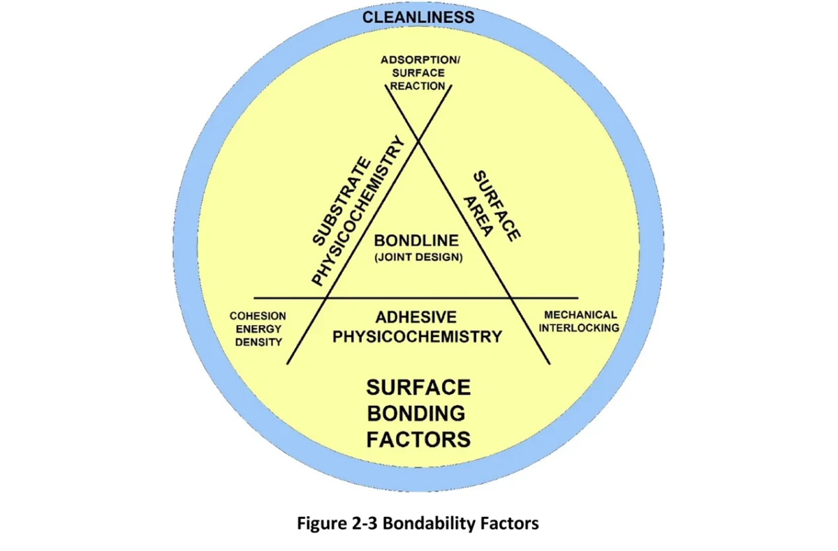 Given this, optimal surface preparation is the essential first step to provide consistent and reliable adhesive or cohesive bond strength. As described in Figure 2-3 major bonding elements comprise substrate, adhesive, bond line surface area and joint design. Key bonding factors that influence adhesion are represented as vertices on the bonding diagram.