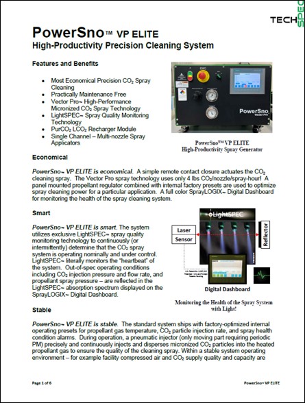 PowerSno™ VP ELITE is an advanced, high-productivity precision cleaning system designed for economical, stable, flexible, and smart CO2 spray cleaning applications in manufacturing environments. Manufactured by CleanLogix LLC, it leverages patented technologies to deliver efficient, maintenance-light, and highly controllable cleaning performance suitable for integration in various industrial tool-lines and production settings.