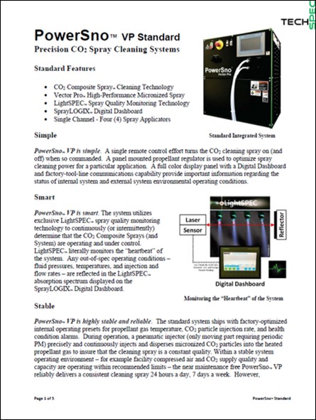The PowerSno™ VP Standard is an advanced precision CO₂ spray cleaning system designed for industrial and manufacturing environments. It combines proprietary CO₂ Composite Spray™ technology with intelligent monitoring and control features to deliver consistent, high-quality cleaning performance. The system integrates the Vector Pro™ high-performance micronized spray generator, LightSPEC™ spray quality monitoring technology, and SprayLOGIX™ Digital Dashboard for real-time system status and environmental condition tracking. PowerSno™ VP is engineered for stability, reliability, and flexibility, offering factory-optimized presets for propellant temperature, CO₂ injection rate, and health monitoring alarms, ensuring continuous operation with minimal maintenance.