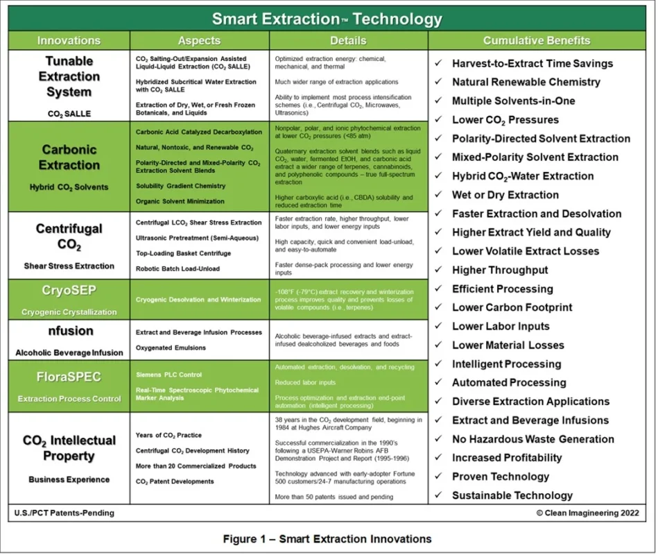 In this regard, our decades-long experience in the development and commercialization of CO2 extraction, immersion, and spray cleaning technology and commercial products for the highly competitive global manufacturing markets has provided us with a valuable perspective and competitive advantage. We are leveraging this extensive experience together with our market-proven CO2 innovation capabilities to develop cost- and performance-effective solutions for exhaustive extraction, in-situ extraction process monitoring, and extract processing. Our latest Smart Extraction innovations are summarized in Figure 1.